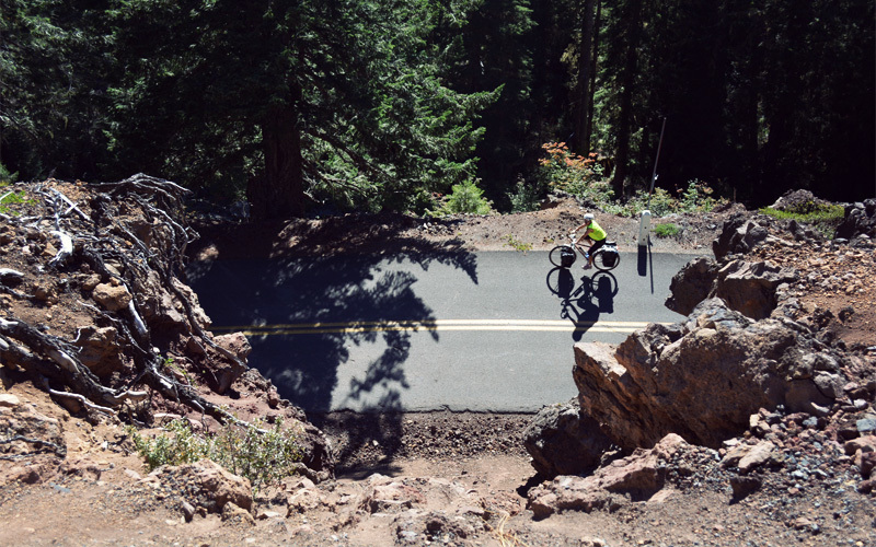 Fueled by gas station pastries and peanut butter and jelly sandwiches with chia seeds — I'll let you guess who ate what — we set out for the climb up to McKenzie Pass. As soon as we make the turn onto Highway 242 it's like we've entered a different world. Gone are the cabins and mobile homes and mini-marts, and in their place we're surrounded by moss, ferns, and trees that stand so close together that even though the sun shines straight overhead we ride in the dark and the cool of the shadows. Although we see large rock outcroppings in the distance and the creeks zigzag down in tight angles, the grade runs at the kind of steepness where we work up a healthy sweat but never feel the need for a mental breakdown in one of the little gravel pullouts that feel soft under blankets of pine needles.