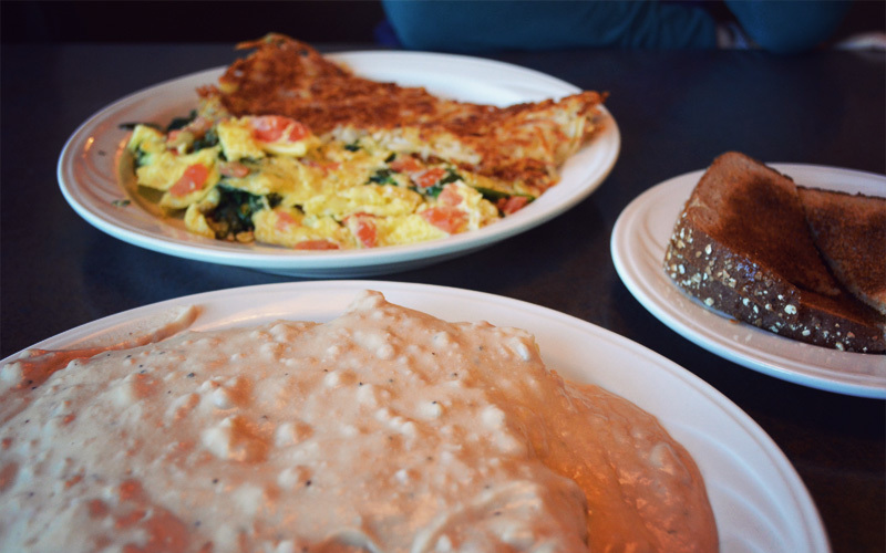 We eat breakfast at a restaurant with wood-paneled walls and booths, rifles and black-and-white photos hanging on the walls, the twang of country music spilling out of the speakers in the ceiling, pies spotlit in a big glass case, and a neon Open sign with a pull-string on-off switch hanging below it. It's everything you'd expect from a Western-themed town like Sisters.