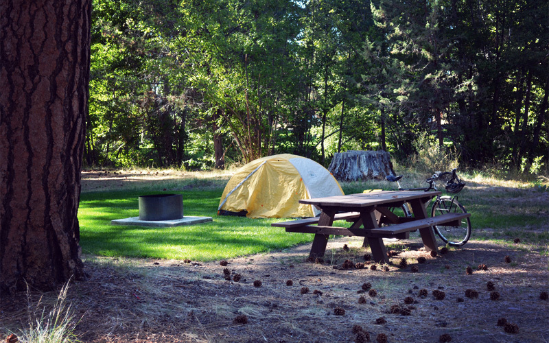 We set up the tent at the city campground near the edge of town, in a corner of the property next to both a quiet creek and a hissing highway. More than one person rides their bicycle to the bathroom, even though you can see the entire place from wherever you happen to be standing. Not far from us, an old man with white hair, who wears sandals with white socks, explains the finer points of his camper's slide-out living room and the adjacent storage locker to a couple of women who are far more interested in this sort of thing than you'd expect.