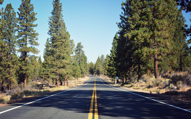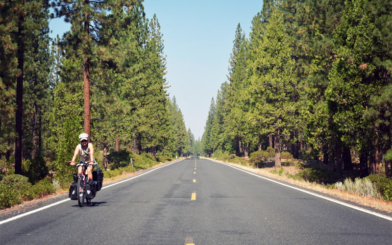 After the turn we lose all of the traffic but gain one of the best back roads we've found so far. Tall pine trees crowd in around us and let us ride in the shadows. Something about the sun hitting the needles must activate their scent, because the air fills with the strongest smell of pine, complemented by a hint of smoke from the forest fires we haven't yet seen. With all of the cars and trucks far distant, all we hear is the whoosh of the wind, the rustle of squirrels in the brush, and the hum of our chains and tires.