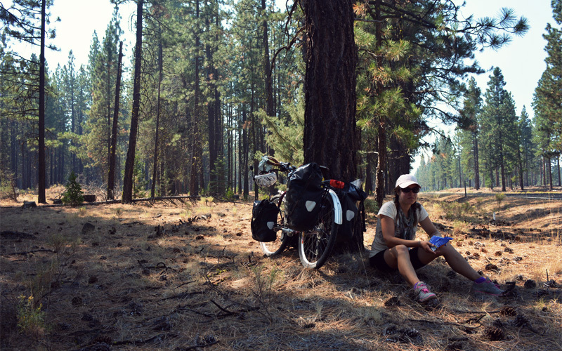 Just past a sign marking 5,000 feet of elevation, and a full 15 miles after leaving Adin, we pull off into a Forest Service campground. Because fall is fast approaching, we get only half an hour before the woods fade to black. Inside the tent our stomachs rumble with hunger while we listen to Billy Bragg and Wilco cover Woody Guthrie's California Stars and look at elevation profiles for the days to come. We'll ride as high as 6,200 feet and then drop all the way down to 250 feet in just three days. As we sit among the crickets and the forest silence it's harder still for us to imagine that at this time next week we'll be among millions of people as we make our way along the edge of San Francisco Bay. But that's part of the magic of California. We're so happy we get to be a part of it.