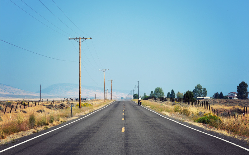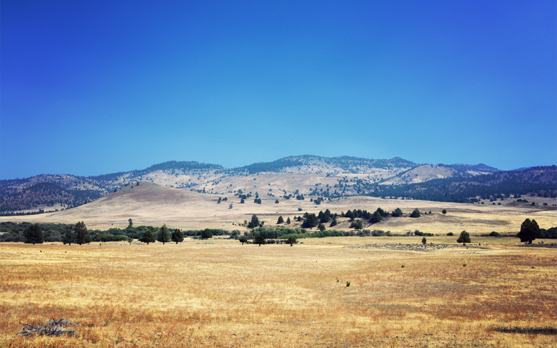 From there we pound dead east across the unimaginatively named Big Valley. It is dry and it is hot and it is yellow. Antelope bound along irrigated fields, dust devils spool up on the tracts that aren't, and tumbleweeds lodge themselves within the fence line. Few vehicles pass, but most are farmers in dirty pickups who give a slow wave of the left hand and a little nod from beneath a wide-brimmed cowboy hat as they pass. In the peak of the sun's brightness and the afternoon's heat it has the feel and the sound of West Texas.