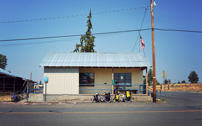 "Jus' about the only time anyone on a motorcycle or bicycle ends up here's 'cause they're lost," says an old man with a big white beard and a bigger stomach when we stop at the the post office in Lookout, population 84. "Only way to get anywhere from here's back the way ya came in."