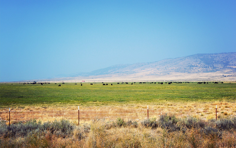 Farther on the road drops down and to the right shoots us out onto a ride that sits above a valley. It looks totally different from where we were five minutes before. There's minimal agriculture and few livestock that we can see, just waves of earth covered in yellow grass and sagebrush and junipers, bound to the east by a tall and lumpy line of mountains covered by a patchwork of yellow and dark green, all of it washed out by the haze that funnels up from the south. Above a cattle pen six vultures circle. Down in the hand of the valley old barns built of dark-colored wood with sheet metal roofs reflect silver in the harsh noontime sun.