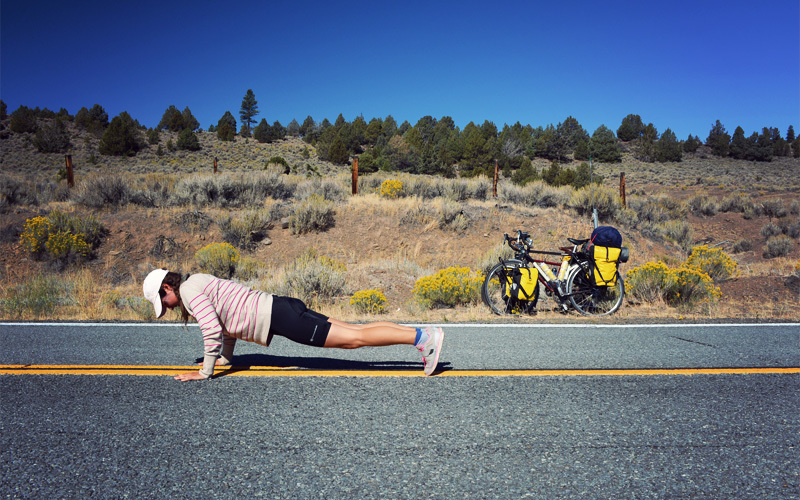 On the way down we pass what the map shows as a small lake, maybe half a mile across. But when we look in that direction today, all we see is lake bed. There's no water left at all, only a broad expanse of brown surrounded by a ring of yellow grass that soon gives way to sagebrush. Farther on we drop into a valley, where cliffs hang a few hundred feet above us on the right, and to the left we look out on flat land that extends for miles but is populated only by a dozen cattle. There's so little traffic that I can hear Kristen singing Disney songs like "Let It Go" and "Part of Your World" as she rides far behind me, and when we stop she can do a full set of push-ups in the middle of the highway without worrying about being run over.