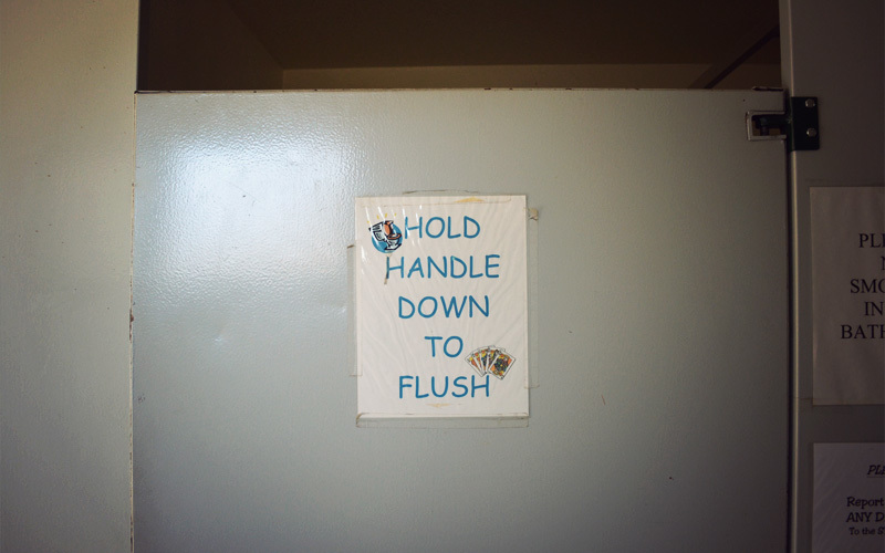 A depressing RV park behind the store remains open and it becomes our home for the next several hours. We escape the hot and shadeless afternoon in its funny-smelling laundry room, which features half a dozen warning signs that are big on clip art and ugly fonts and all-caps text, and where the first magazine at the top of the stack is an issue of Time from 2008 that's heavy on Sarah Palin content. When I take a shower for the first time in eight days, the water that falls off my body runs in black droplets down the walls and settles in a murky pool around my feet before it swirls down the drain. One woman walking a suspicious old hound dog says hello from a distance, but that's the only person we see in the more than three hours we spend camped out in our restroom-laundry compound.