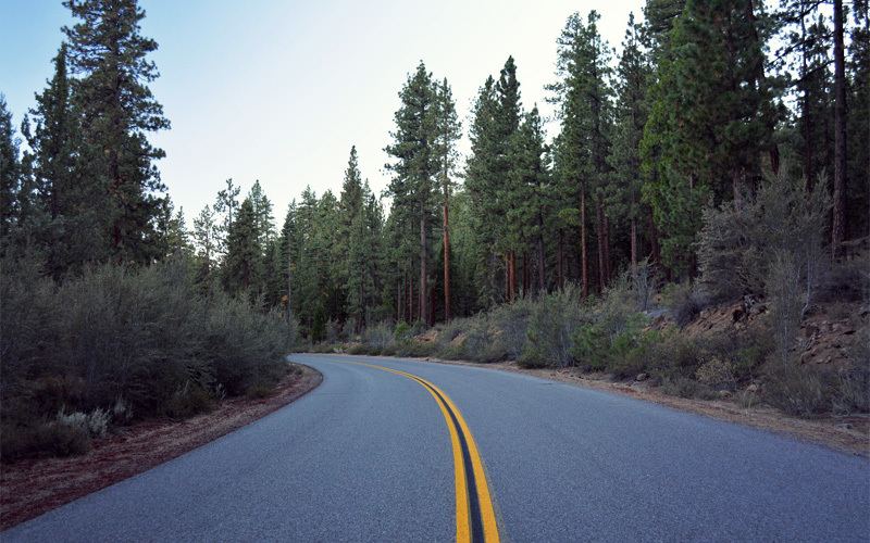 The climb and descent that follow take us to Eagle Lake — or at least what's left of Eagle Lake. Looking down from the highway we see a small sheen of blue in the distance, but surrounding it is a skirt of dried mud and dying grass and other plants that look like they extend for at least a mile between the water and the shoreline. It's a clear visualization of what kind of effect three long, hot, drought-stricken summers have had on this part of the country. As a result, the one general store and restaurant we find are both closed, and have been for some time. Pine needles lay in dry piles like little mountains on the deck and the signs printed on white paper and then posted on the doors are starting to yellow at the edges.