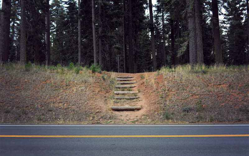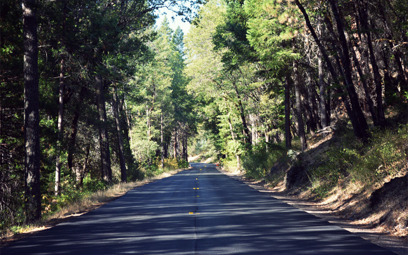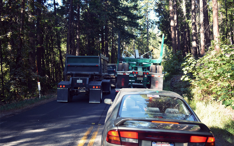 Soon we stop again, but this time it's because the road has been reduced to one lane for repaving. It's the best thing that could have happened to us. Although traffic is light on this Friday morning, and everyone who passes us gives a lot of room, Highway 32 is still a dangerous place for bicycles that requires constant attention. But the construction delay does two things. One, it lets us travel down the last five miles of the massive descent all alone, while the dozen cars that reached the flagman before us go ahead behind a pilot truck. And two, after we bottom out and start to go up, all of the cars and the vans and the dozens of logging trucks driven by bearded men on speed that are headed our way get bottled up in the work zone for fifteen to twenty minutes at a time. That sends them all past in one exhaust-filled rush, which allows us to pull off for thirty seconds, let them all go, and then ride on in peace and quiet among the sights and sounds of the woods without having to check our rearview mirrors every eight seconds.