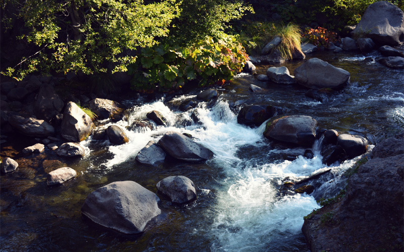 But we can't stay stopped and wait for the sun that may or may not exist anymore, because we still have another fifty miles to Chico. So halfway frozen we hop back on our bikes and return to the descent. If you ignore the cold, the twists and turns that follow the bends of the creek make for some of the most exhilarating riding we've had. On our left, huge pine trees grasp on to rocky ground that seems to go up at a forty-five degree angle, while on our right we pass huge rock formations and little waterfalls and start to see deciduous trees for the first time in weeks.