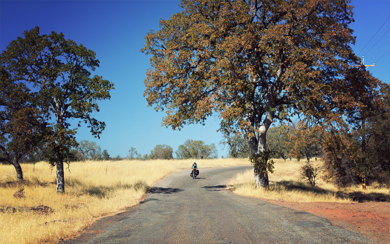 Five miles from town we head off Highway 32 and down Humboldt Road, all alone, past fields of dry yellow grass that crinkle in the breeze and in the shadows of some variety of tree that we can't identify but whose branches sag down so far they almost touch the ground. Judging from its narrow width and the fact that it rattles loose every bolt on our bicycles (and actually disconnects one of the stabilizing arms of the front rack on Kristen's bike), it might have been the first road ever built in this state, and then never worked on again. But it doesn't matter, because even though it's a rough ride it means that we made it, that the section of road I dreaded more than any other on this trip stands in our dust. We reward ourselves with beers at the first bar we find in downtown Chico, which we reach by passing through the first stop lights we've seen since Bend, Oregon eight days ago.