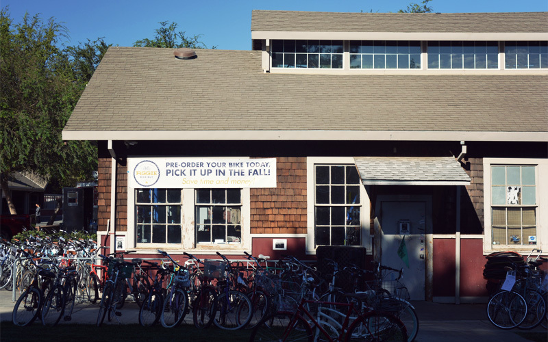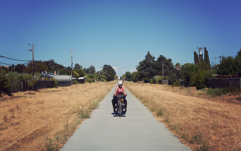We wake up for about an hour around 5:00 a.m., then fall back asleep, and don't end up riding away from the motel until after 9:00. Our bodies continue to recover from all of the mountain riding we finished a few days ago. On the way out of town we pass through the campus of the University of California-Davis. It has the old buildings and leafy trees and young people that all colleges are required to have, but what stands out at Davis are the bicycles, because they are everywhere. Even though class isn't yet in session, the roads and paths are thick with riders. There are dedicated bike lanes, roundabouts to control traffic, and instead of parking lots we see bicycle racks by the hundreds. It's a wonderful example of how the world would look different if we designed around bikes instead of cars and trucks.