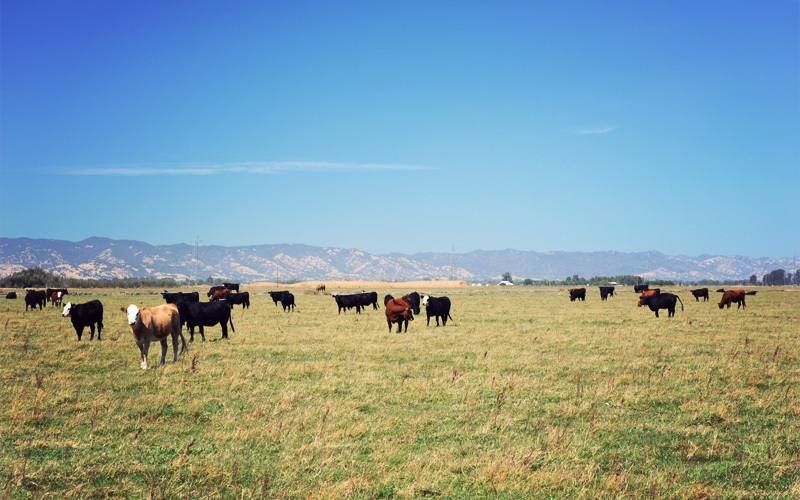 And then in less than a mile we cross a set of railroad lines and we're back into the country, riding by fields of dead sunflowers, tomatoes being harvested, cows being cows, and stopping to wait for thick white clouds of fertilizer to blow past us. I run over every tomato that sits on the shoulders, sometimes fast enough that the impact shoots the juice and the seeds up onto my legs, where it gets caught in the hair and dries in place. Every squish leaves a little wet patch on my front tire that flashes past every half second.