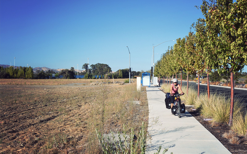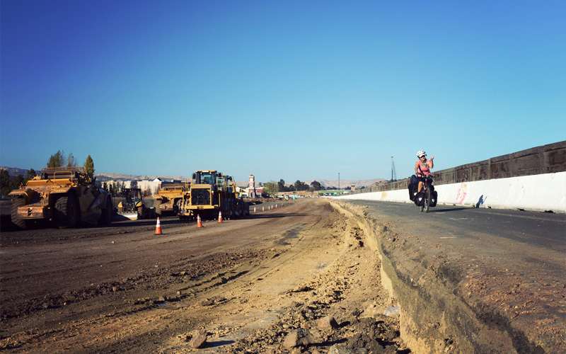 It's been a tough day — one of the toughest so far — but we're making progress. All that's left to do is climb over a small line of mountains and then drop down into Vallejo, where we're staying with a Warm Showers host for the night. But before we can reach the base of those mountains, the freeway elbows its way into our path. The directions I put together at home show a path running along the northern edge of the freeway for a mile or two, which then lets us cross over it on a little-used overpass and continue on from there without too much trouble. However, when we roll up to where the path should be, we instead see a landscape of dirt and orange barrels and earth movers that seem to be widening the interstate from eight lanes to roughly seventeen. Looking out at this mass of progress I see a narrow ribbon of pavement that still exists, running along the freeway, up toward the foothills, in the direction of the overpass that we're looking for. I figure the engineers left the path intact so that bicycle riders could make it through the chaos and continue on their way. How nice of them! So I call out "To the top!" to Kristen and we press on, not thrilled about what's laid in front of us, but happy we'll at least be able to power past it.