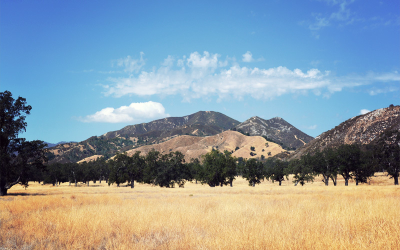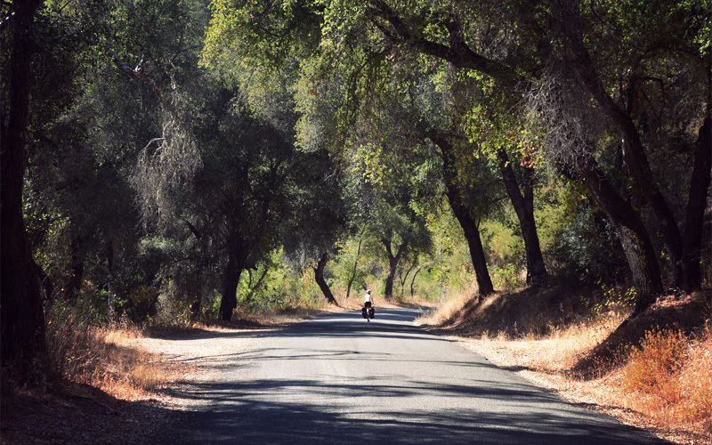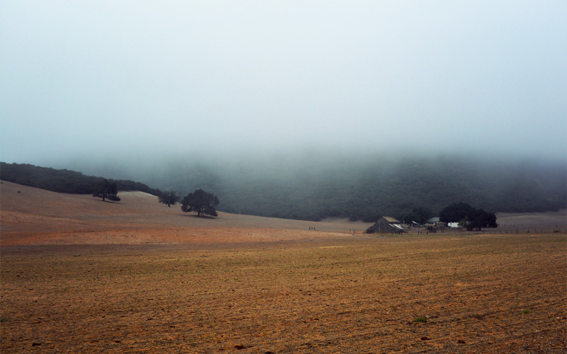 On the back side of a long climb we speed into a valley, where we startle a white-tailed rabbit who dashes across the road in front of us before disappearing in the brush. I wonder out loud if animals have the same sort of inner monologue that humans do, and if they do, what the rabbir or deer or squirrel equivalent of oh-shit-oh-shit would sound like. As we coast into the valley the fog lifts and the sun shines down on the hills and reflects back in pale shades. It's all unusually untouched; there aren't houses or farms or cattle or ATVs buzzing all around. We imagine that's much how things looked 200 years ago, when the El Camino Real — of which the road we're riding on was a part — was the route that connected the twenty-one missions of what was then the Spanish province of Alta California. Well, except for the live machine gun fire that thumps and pops from the military base that sits beyond the fence line on all sides. That's probably a more recent thing.