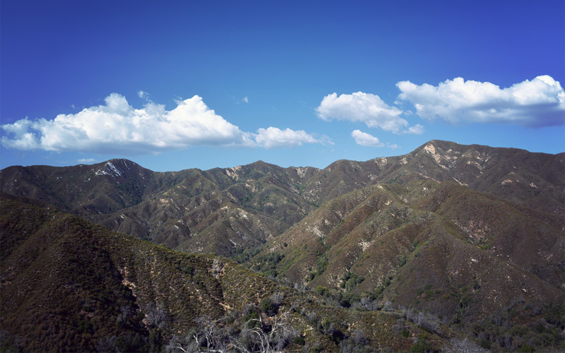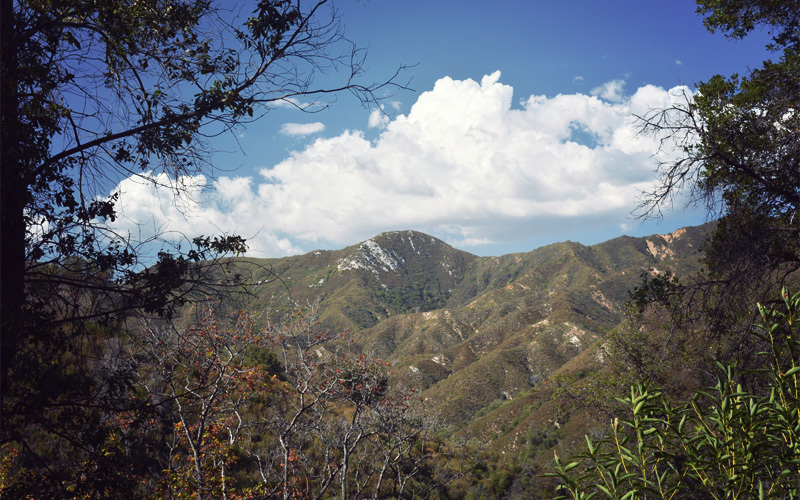 Eventually we cross out of army territory and into the Los Padres National Forest. Almost at once the road narrows to just wider than a lane and we enter a quiet tunnel of trees. The smooth rock of a dry creek bed follows us on the left, while near-vertical cliffs of rock hem us in on the right. Soon we find a campground where we eat lunch, refill our water supply, and rest our legs. The plan upon leaving King City was to make it this far and stop for the day, but we reach it by 1:30 and still feel strong. We're also motivated by the fact that the top of the climb, and a view out to the Pacific Ocean, lies just seven miles away.