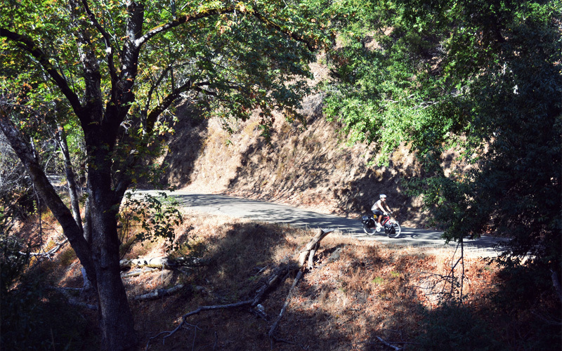 The first four miles pass without trouble, in part because the grade isn't that steep, but also because the beauty keeps our eyes up on the world and off of our bike computers. The leaves of the trees come alive with sound in the breeze that now blows near-cold and never lets us forget that the ocean is close. And there are so many trees, all packed tight among one another, and all of them a deep and healthy green. Even the underbrush is green wherever we look. We've now come far enough west that we're within the path of the rains that crash into the coast from off the Pacific. Best of all, we get to enjoy it unspoiled. There are no barbed wire fences, no farms, no impact craters, no logging, no range cattle, and perhaps one car every twenty minutes. I've traveled a lot of beautiful places by bicycle, but this stretch stands above all but a select few.