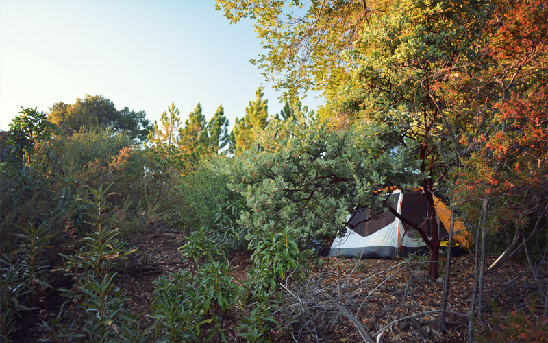 We could fly down that direction and in seven easy miles reach the shore, but that's not the outcome befitting of this day. Instead we turn left, onto a dirt road that runs along the crest line of the mountains. It's our last half-mile push. It is hard and it is tough, but in the end it's worth all of the grinding and cursing and pedal standing. We reach an opening in the trees, then pull our bikes up to another smaller and flatter clearing, and at once we know we've arrived at our new home. Spread out before us we see a fat green finger of mountain that extends down toward the ocean. The land is in the process of being swallowed from the bottom up by a wave of pure white clouds inching their way onshore. Around us we hear nothing but a few bird calls, the buzz of the dozen flies that have followed us like paparazzi all day, the rustling of bushes, and of course the constant and subtle spooling of the wind as it pushes its way through and around the trees. I've stayed at many great campsites over the years, but what I see laid out in front of me looms with more grandeur and spectacle than all the rest. There's no need for debate.