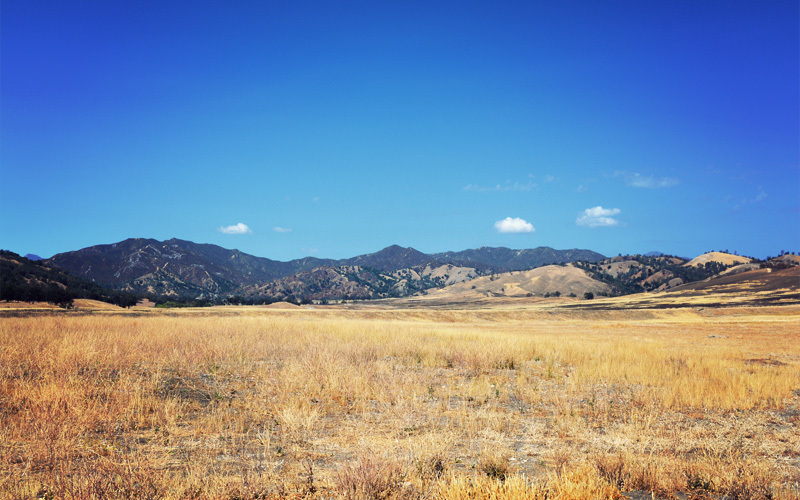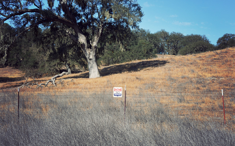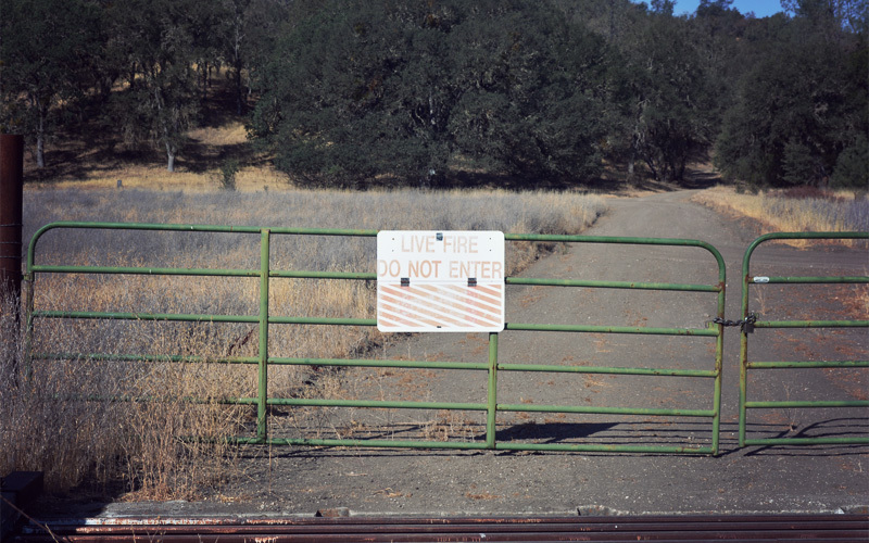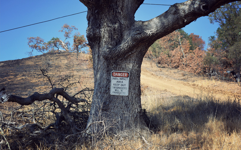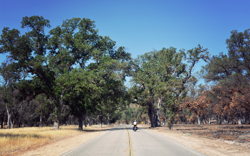 Soon we turn left and cross over an almost dry riverbed on a road named Nacimiento-Fergusson. The first part runs through military land, which brings together an unusual collection of nature and instruments of death. We ride among handsome oak trees whose branches cast shade across the two-lane road. When we crest the top of a hill we look out at broad expanses of grass that look like African savanna and stretch out toward a hard-angled mountain to the north. As we coast along the narrow plain a coyote runs in our same direction for a few moments before falling out of sight within the tall grass. The only unnatural sound out here is the hum of bike tires on pavement, although sprinkled in among all of the beauty are countless signs warning of live fire and unexploded ordnance. And then of course there are all of the halos of some kind of whitish powder that mark the impact points of bombs or missiles or tank blasts, which are themselves surrounded by black char from the fires that follow.