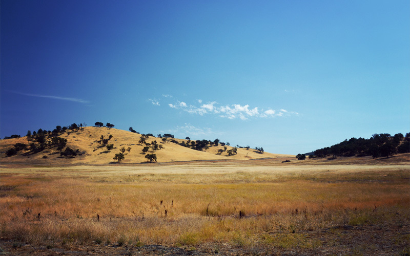 On the road we head south under the thickest cover of clouds we've seen in three weeks. We see dozens of men and women in the fields getting ready to start a long day of picking. The grape harvesting machines have already started, their headlights glowing as they first shake the ripe grapes off the vine and then shoot them up a conveyor belt and over into the trailer of a tractor that follows nearby. Along the way we alternate between dodging a tarantula that crawls near the edge of the shoulder; giving voice to the inner monologue of the cows on the other side of the barbed wire; considering the improbable premise of the 1970s TV show CHiPs; talking about the nuances of the show Cops, which we both watched all the time when we were kids; and coming up with the kind of jokes that would be funny only to a table full of eighty-year-olds. Surrounded by the morning mist we also start our climb into the mountains, where the sea of agriculture recedes, and in its place the landscape becomes drier and yellower, which is how we imagine all of this area would look without the guiding hand of irrigation.