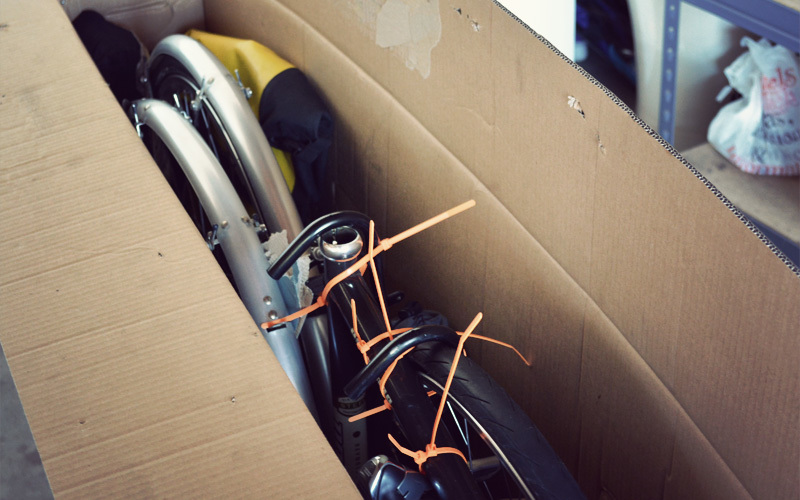 The sleeping bag, the tent, and a dozen other bits of gear that together weight in at almost fifty pounds get crammed into a third box that bends out at its sides and requires an intricate dance of squeezing and grunting and aggressive taping to close. It looks like it could explode and send sleeping pads and panniers shooting into all corners of the garage at any moment.