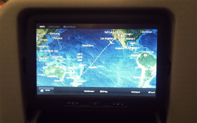 Within an hour the clock rolls over to midnight. Even though it feels like it's time to go to sleep, we soon find a dinner of spongy beef chunks placed on the narrow folding trays in front of us. Auckland lies another eleven-and-a-half hours to the west.