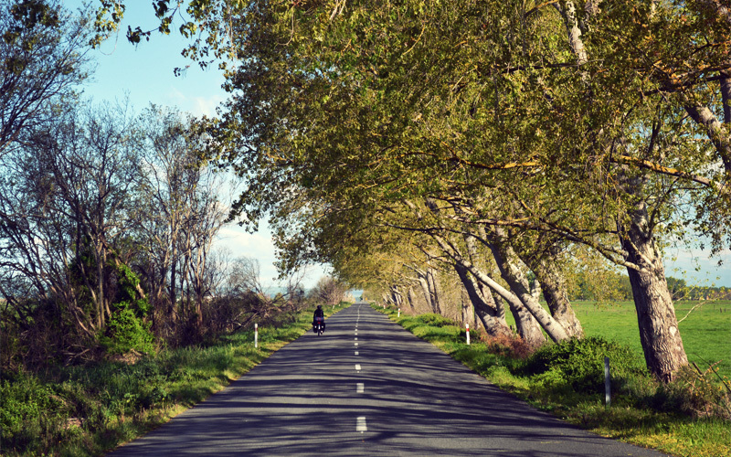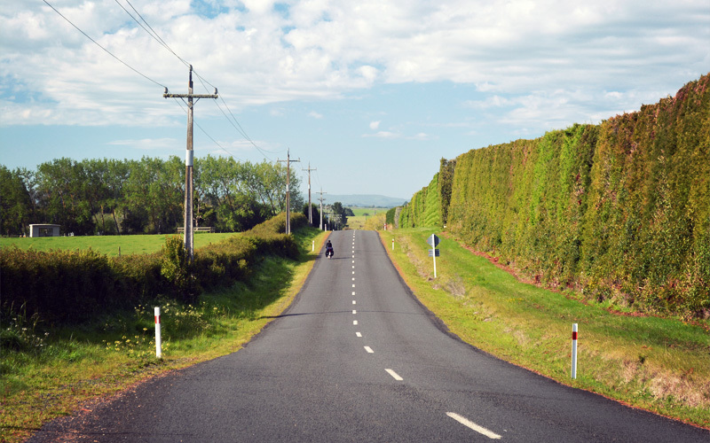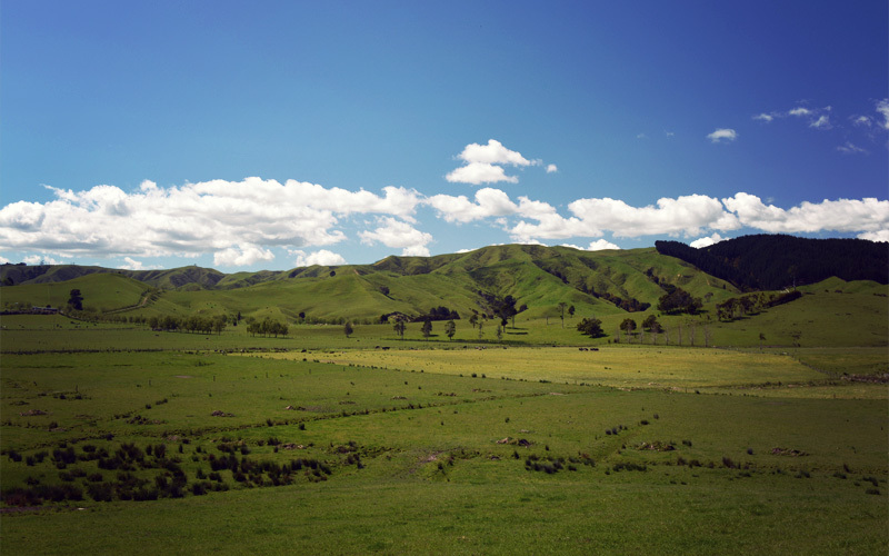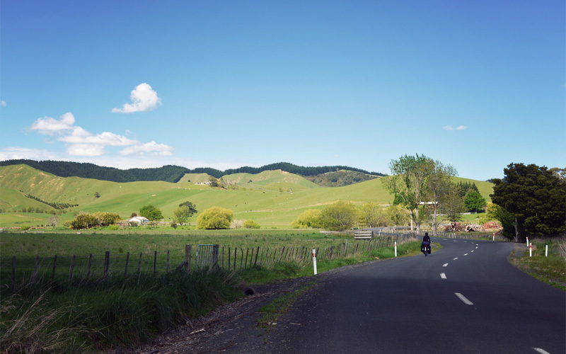 The world around us remains peaceful as a result, with greens more bright and lush and healthy-looking than just about anything we've ever seen. Although New Zealand is known for rainy weather in the spring, we ride under blue skies and a wind that's cold but not so strong that it brings a chill along with it.