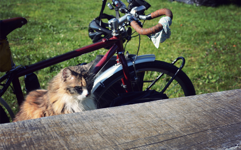 At several points throughout the night I wake up to the sound of intense purring. When I look over to my right I see the head of a cat who has crawled underneath the edges of the rain fly staring back at me. We gave him the name of Stubbs McGee the night before, on account of his short legs, stubbed tail, and chubby little body. Each time he comes over he has this look on his face that says, Hey, I heard you moving around in the sleeping bag, so you must be awake, and since you're so obviously awake why don't you crawl out of the tent and scratch my face? I've had all kinds of things keep me up during my years of bicycle touring, from trains and thunderstorms to barking dogs, loud music, and even air raid sirens, but an aggressively affectionate cat is a first.