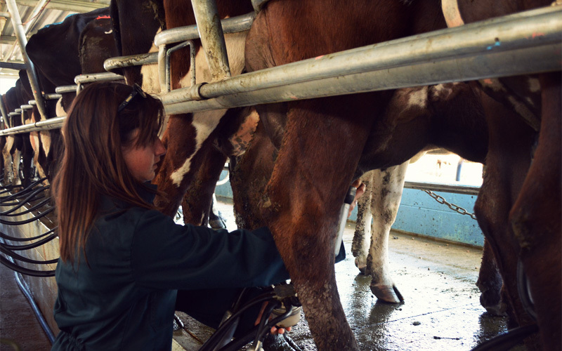 When we arrive we see several small buildings arranged around a larger covered but open-sided structure. That's where two workers, positioned far closer to a bunch of cow assholes than most anyone would be comfortable with, handle an extensive series of rubber tubes and nozzles that together allow them to milk what look like forty or fifty cows in only a matter of minutes. With Robyn's encouragement we stumble our way into the middle of this well-choreographed dance, with Kristen learning how to match the equipment to wiggling parts of cow anatomy while I try to simultaneously take pictures, dodge powerful streams of cow poop, and avoid taking the strong kick of a hoof to the side of my face.