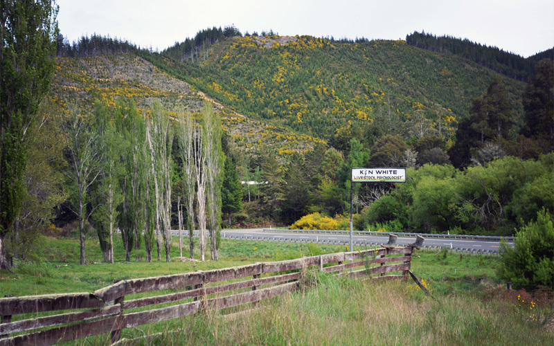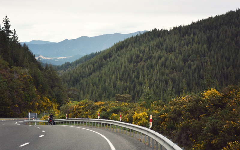 Only a few miles down the road we round a corner and see ahead of us hillsides covered with indigenous trees and vegetation, which give the complete opposite impression. They are lush and thick and varied in size, color, texture, smell, and purpose. And as we learned last night, this is how they'll look even hundreds of years from now, because the government of New Zealand has made it illegal to cut down native forests. The trees are stunning and give us something beautiful to look at and think about as we crank up steep hills at four miles per hour with cold headwinds bearing down on us and the stink of motorcycle exhaust filling our noses.