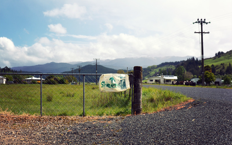 We wait out a few rounds of showers at a cafe in the little town of Tapawera. It's the kind of place that in the back corner has a bunch of home-related stuff for sale, like those fake-weathered wood panels that say things like, "Always tell the truth, even if it hurts" and "The laundry room is self-cleaning ... Do it yourself!" To find out that shit like this exists everywhere, not just in awful little knick-knack shops back home, somehow makes the scope of America's influence on globalization feel more real than all of the fast food chains and fashion brands and imported SUVs that we've seen so far combined.