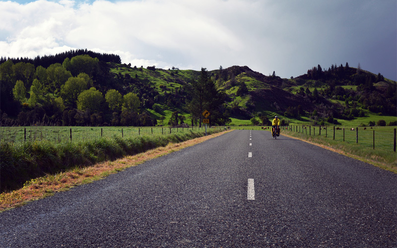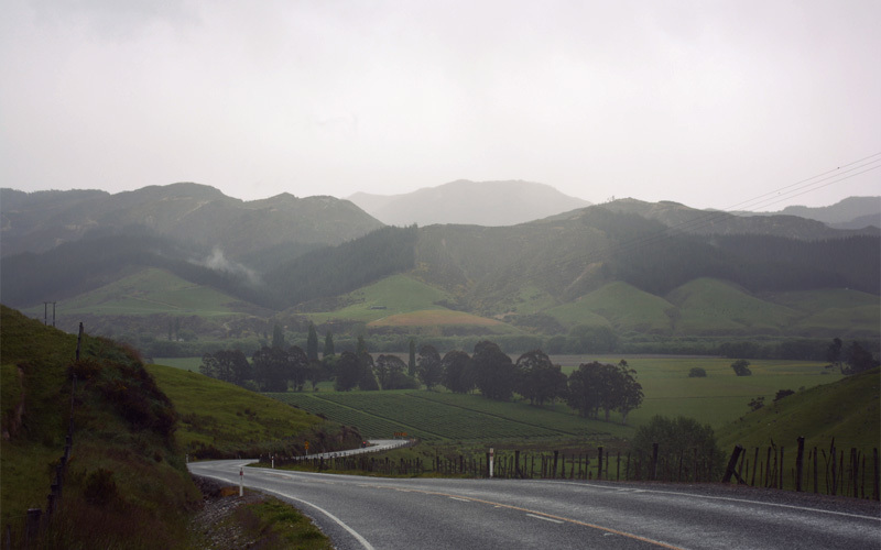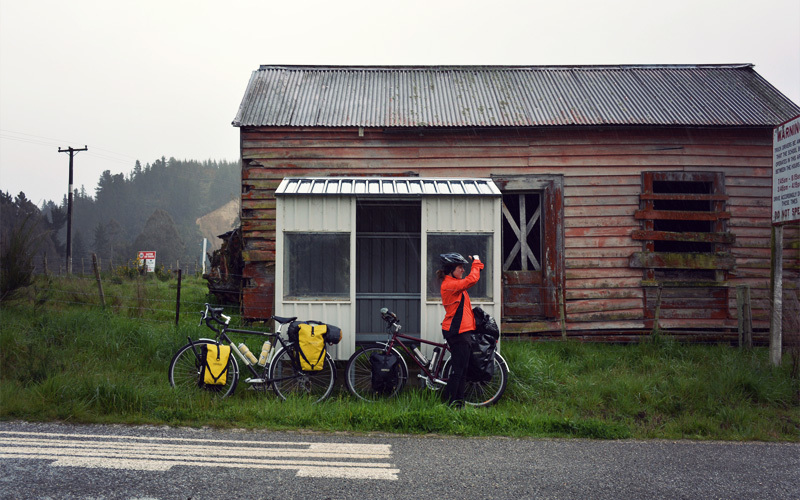 In the middle of another downpour we come across an easement a few dozen feet off the road that leads between two paddocks, toward a river, and eventually on to the trailhead of a Department of Conservation walking path. I want to keep going, to push hard and try to reach the campground that's twelve miles up the road, where we'll find water and a bathroom and maybe shelter that we can put the tent up beneath. But Kristen is cold and wet, and when I ask her if she wants to do the same I know the answer before the question leaves my mouth.