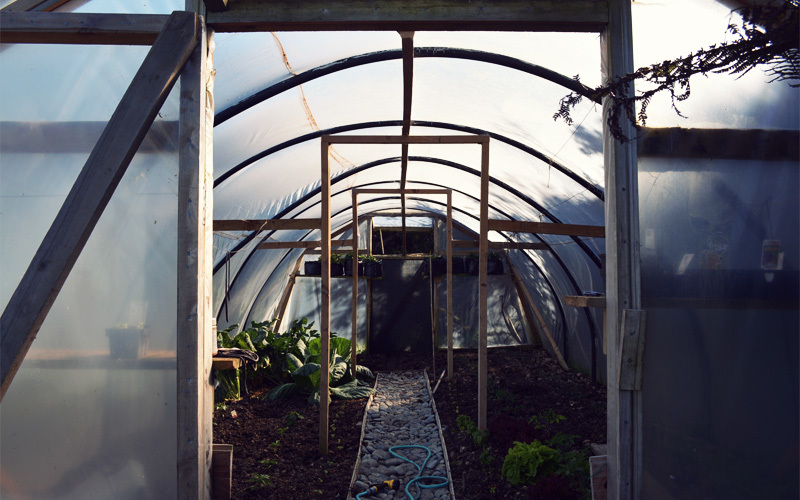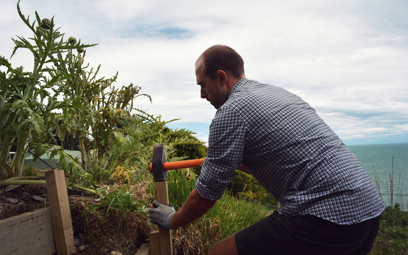 On Monday morning we ride half a dozen miles north from the depressing but intensely profitable holiday park into the teeth of a frigid headwind that threatens to push us down the coast in reverse. After climbing up the steepest sustained hill we've ever seen, we arrive on the doorstep of a modest-sized single-family home. Out back, on a terraced slope that heads down toward the sea, are a series of gardens, a greenhouse, a large enclosure for chickens, a sandbox, a few benches, scattered children's toys, and a network of wandering paths that connect them all. It's our new home and our new work site.