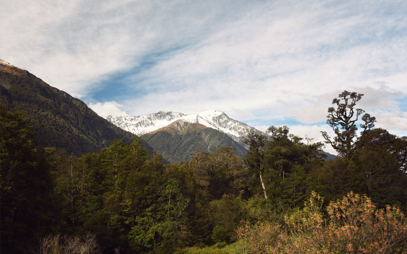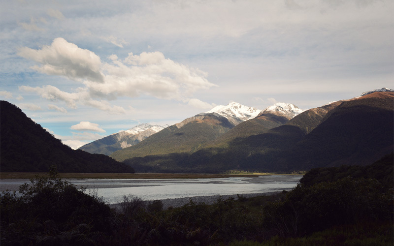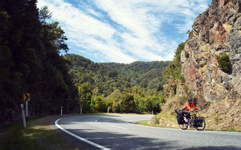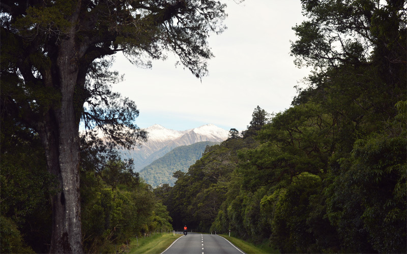 It doesn't get any easier to describe what waits for us beyond Haast. It's hard to even decide where to start. There are the dozens of waterfalls that shoot down toward fast-moving creeks, but there are also the hills and mountains that tower above so steep and so tall that it hurts our necks to try and look up at the tops while pedaling. Then there's the Haast River, which reflects a shade of blue so vibrant it looks fake, or at least chemically altered in some severe and unnatural way. We also catch ourselves staring into the forests running alongside the road, the ones that are so thick it's impossible to see more than about thirty feet into them unless they're spotlit by the sun.
