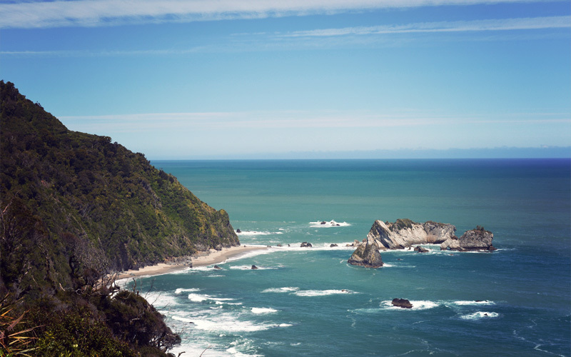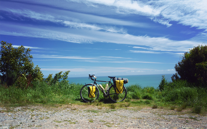 The riding remains spectacular into the afternoon. When the highway curves toward the sea we look out on an unbroken expanse of turquoise. Closer toward land, the waves crash over jagged little islands of rock before falling into the shore on flawless sandy beaches. When we stop, tui birds land in the trees not twenty feet away from us, and we look almost straight up at rock slides that reveal a hundred tones of brown and tan and amber that had until just a few months ago been hidden inside of the hills for thousands of years. All of the hard uphill cranking proves worth the work as I fly down hills with so much speed that tears blur my vision before sneaking out the corners of my eyes, running in wandering lines back across my temples, and then coming to rest at the edge of my sideburns.