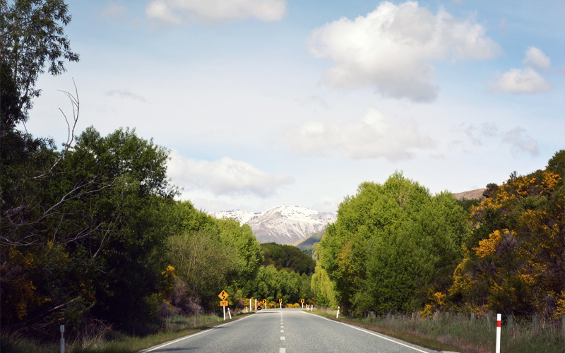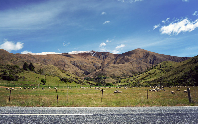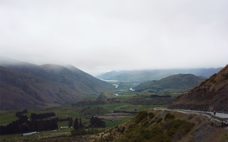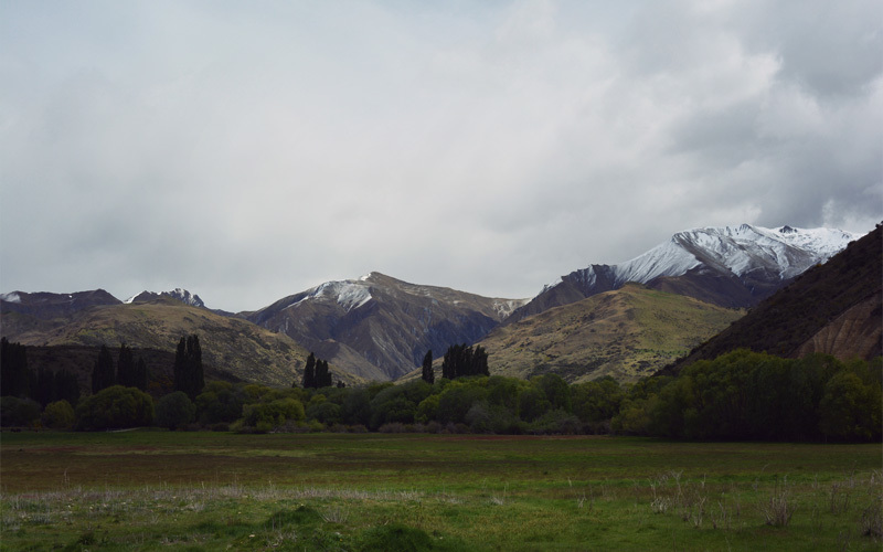 Beyond the bistros, tract housing, designer dog breeds, and rock climbing gyms of Wanaka we head south and follow the curves of the Cardrona Valley. We ride among the smell of fresh-cut grass, the bleating of sheep, an endless series of paddocks, rows of plastic-wrapped hay bales that sit all alone in the middle of a field, and a dusting of snow so light on the closest hilltops that it looks more like powdered sugar. The combination of greens and yellows, the texture of the hills, the thick bands of trees along the banks of the river, and the color of the sky all remind me of Western Montana. They make my heart swell with awe and happiness and appreciation in much the same way.