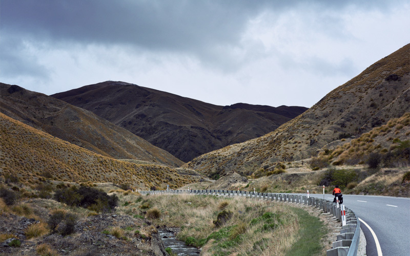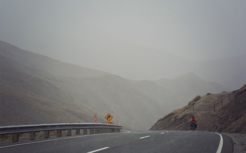 When the clouds thicken, we grind. When the wind blows with more force and anger, we grind. When the grade steepens again and the shoulder falls away to nothing, we grind. When tiny snowflakes start to fall as we near the top of the climb, we grind. When the wind reverses course and blows bigger snowflakes straight into our eyes and ears and freezes our faces in the process, we grind. We stop grinding when we reach the pass that crosses over the Crown Range, but only to talk about how cold we are and to put on rain pants for the horrible descent that's about to start.