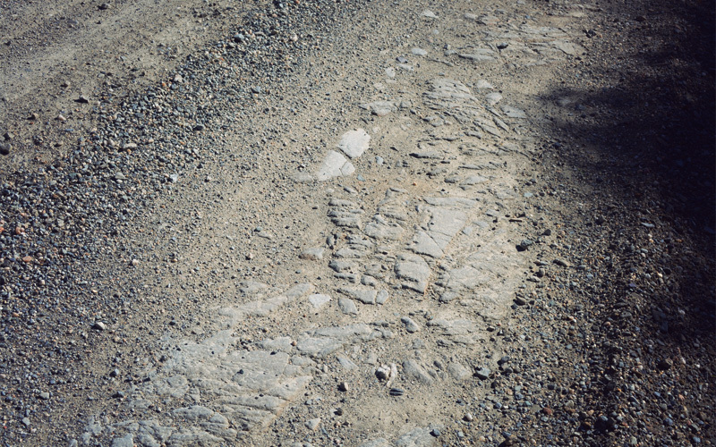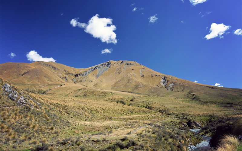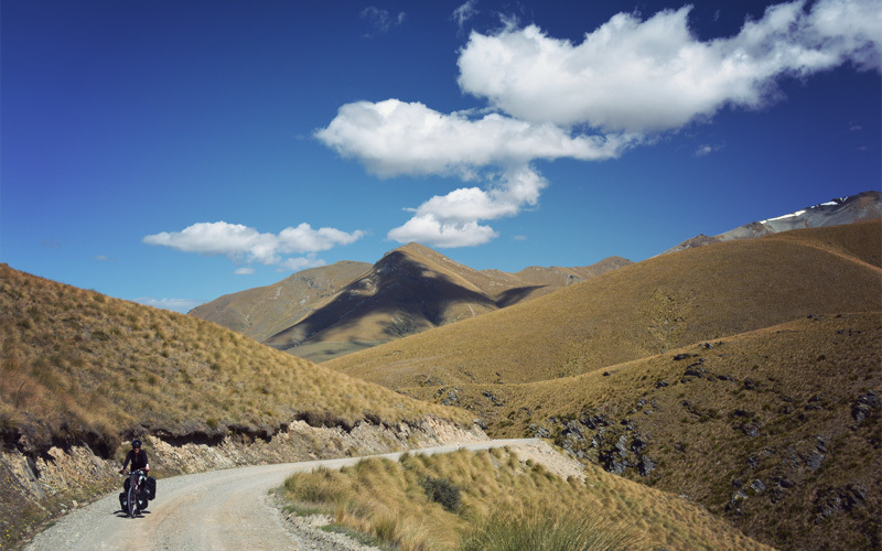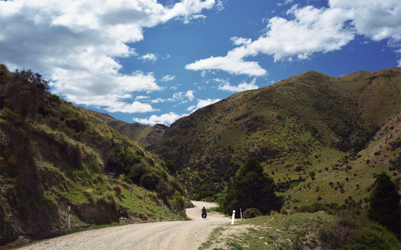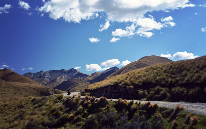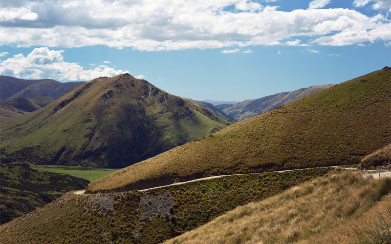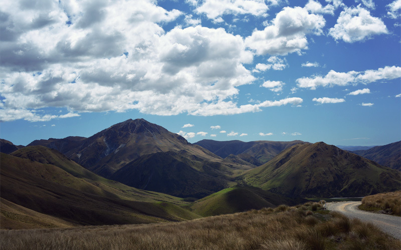 We ride over sections of road that were blasted out of schist and into existence, where the marks of pickaxes are still visible in both the road surface and the walls of rock that go straight up on our right. No matter which direction we look we can't see any fences, just layer after layer of hills, all of them thick with clumps of yellow tussock grass.