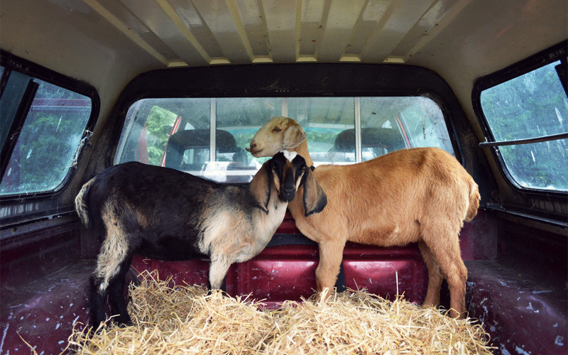 In the end, as with every other task I'm asked to do on the farm, I struggle and struggle and think I'm about to fail before finally something in my head clicks and I figure it out. And with the goat under control I walk out of the barn, carry it a few hundred feet down a hill, and then drop it in the back of the truck with its new herd-mate.