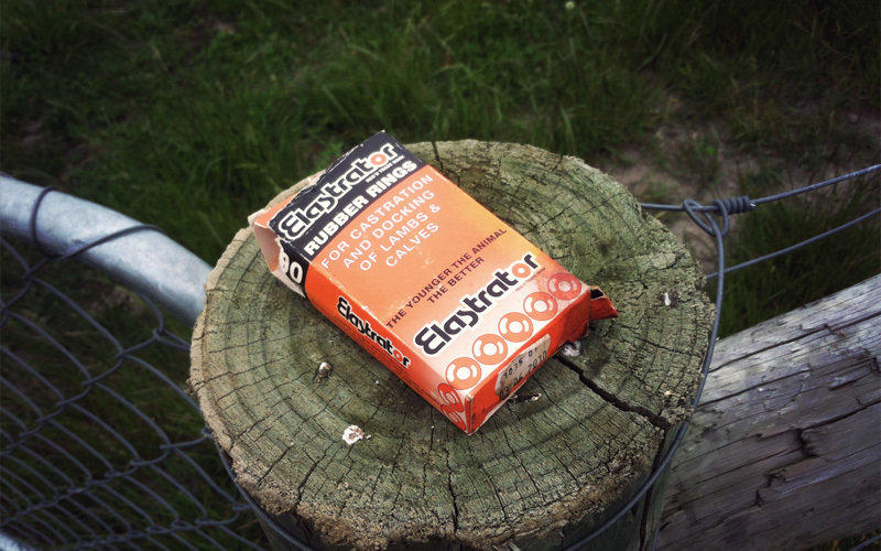Interesting experiences you can't find anywhere but on an animal farm are everywhere. Among these are the two times when we take part in the process of castration, first with a little goat and then with a big calf. To make this kind of thing happen, the person doing the work takes a stainless steel device that looks like a pair of pliers and places a tiny plastic band about the width of a Cheerio around the end of a set of prongs. When the handle of the pliers are extended the prongs stretch the band to the width of a golf ball, which allows it to fit over the little pair of animal balls and flush again the stomach. When the tension is released, the band snaps tight against the top of the scrotum and begins to starve the contents of the package of their blood supply. Within a few days time the tissue dies, the nuts fall off, and life on the farm continues on the way life on farms does.