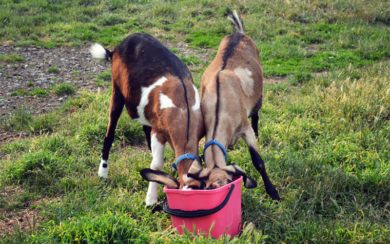 Some time between 5:30 and 6:30 in the evening we walk over to the barn area for the last time, where we fill the food buckets with a mixture of barley mash and alfalfa and then top up the buckets of water. As soon as this is done, we swing open the gate that separates the paddock and the barn area, and at once the tinkling of a dozen tiny bells and the bleating of goat calls fill our ears as the animals hoof it as fast as they can toward their dinner. By the end of the week we're able to recognize which goat is talking based only on the sound of their voice.