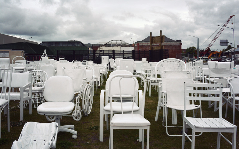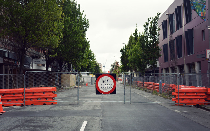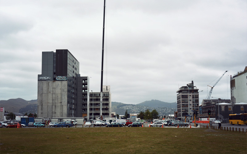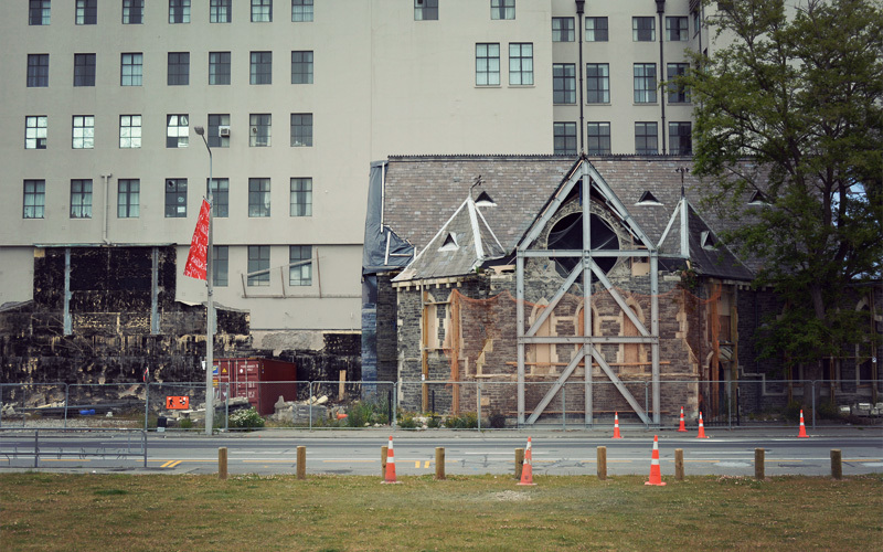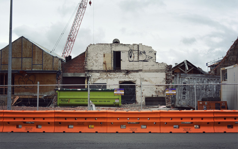 It doesn't matter where we walk, the urban landscape is an unsettled mix of cranes, metal construction site fencing, buttresses, stacks of drywall, ladders, scaffolding, excavation machines, dumpsters, and orange traffic cones by the thousands. Some buildings have been reduced to shells, and some to only a few free-standing sections of walls. Hundreds of others have been torn down, hauled away, and all that remains is a barren patch of earth covered only with dirt or gravel or weeds. There are memorials to century-old churches and museums that no longer exist, and homemade banners that announce how the property owner is still in litigation with the federal Earthquake Commission after more than three years of negotiations. Dozens of stores and art galleries and even the city's central cathedral are housed in cheap, temporary structures of sheet metal, plastic, and reinforced cardboard until insurance claims are processed, revitalization plans finalized, and reconstruction completed.