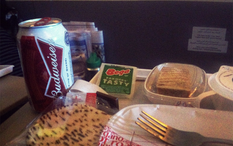 The drinks are free as well. When the beverage cart comes around, I notice a pair of Budweiser beers perched on the edge, and then I feel this little surge of joy rush up and down my body. Because if you find yourself flying between New Zealand and Australia on an airplane bound for Sydney and then Bangkok and Dubai, and you're presented with the chance for a half-cold can of Budweiser decorated in the colors of the American flag, you make the most of that chance — that familiar, patriotic, watered-down chance.