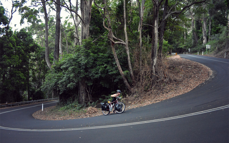 The first half of the climb runs as steep as anything I've yet experienced, which sends us into the stop-every-quarter-mile game so that we can catch our breath, wipe our brows, and try to stay hydrated. But the slow pace also gives us the chance to appreciate how we're able to ride all alone among the exotic-sounding birds, the chirps of crickets, wombats that scuttle around in the bush that runs right up to the road's edge, and the strong smell of eucalyptus.