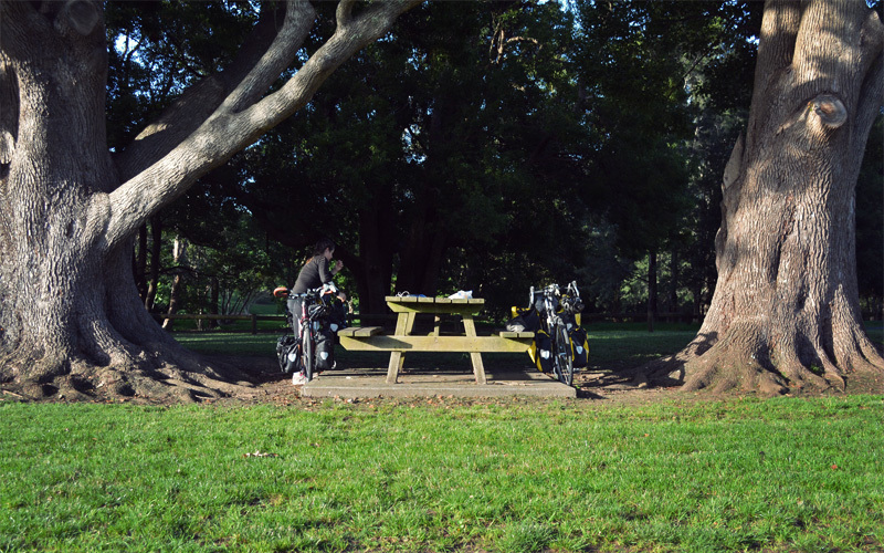 A local tells us that it's okay to camp in the park, that no one will bother us. But we notice a symbol indicating that no tents are allowed, and we also see a sign advertising a Christmas concert for later in the evening that we think will bring in a bunch of people, so we decide not to press our luck. It's a decision that means we'll tackle the longest, steepest climb of our Australian adventure on our first day of riding.