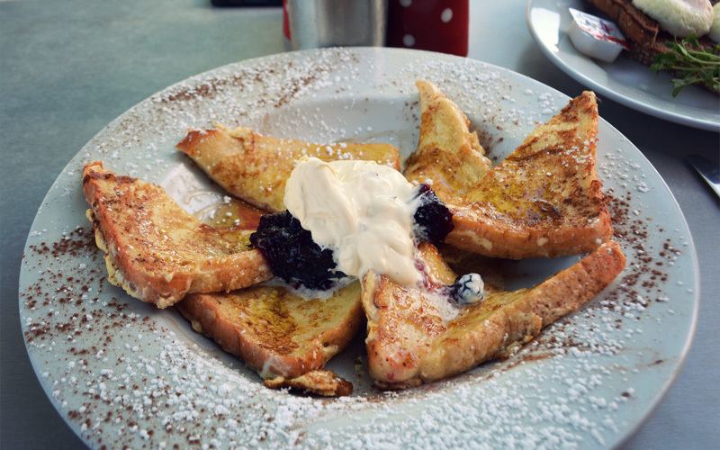 In the end, a late-model Mazda sedan heads by in the other direction just before we reach the town of Gunning, almost two hours after we started riding. We take advantage of the continued existence of civilization by stopping into a cafe and eating overpriced but delicious French toast and poached eggs.