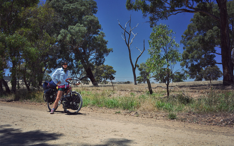 The unsealed surface on the back road between Jerrawa and Yass brings with it soft patches of dirt, more pot holes, and short sections of washboard, but it hardly bothers us. We're too happy riding away from traffic and instead having the peace and quiet to better enjoy the cicadas, the kangaroos, and the darker-colored bark and leaves of the blue gum tree, whose pale blue color reminds us of North American junipers.