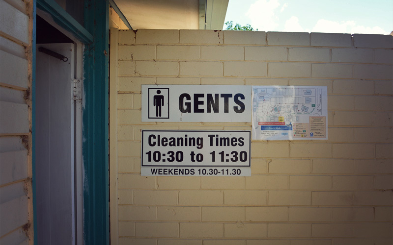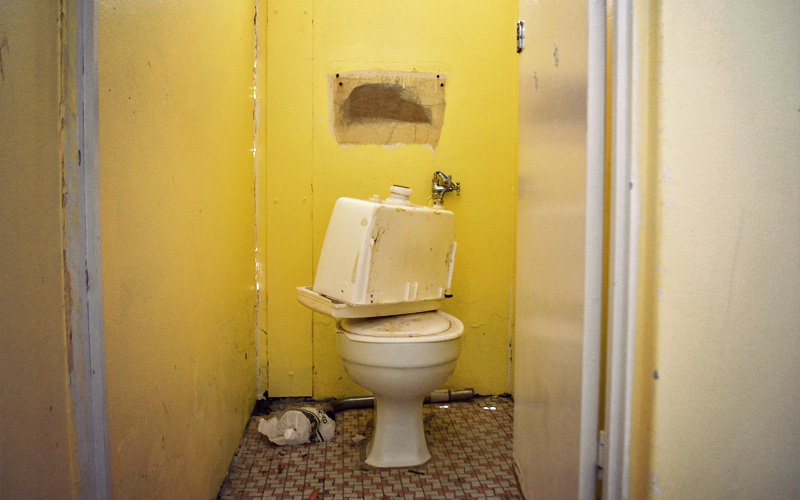 When I go to use the bathroom, I step around two dozen nails sitting on the sidewalk that leads toward the door. Inside I see that the only roll of toilet paper sits on the counter next to the sinks, which are of course coated in a thick layer of dirt. When I go to reach for it, I notice a reddish-brown, finger-sized mark that's either blood or poop.
