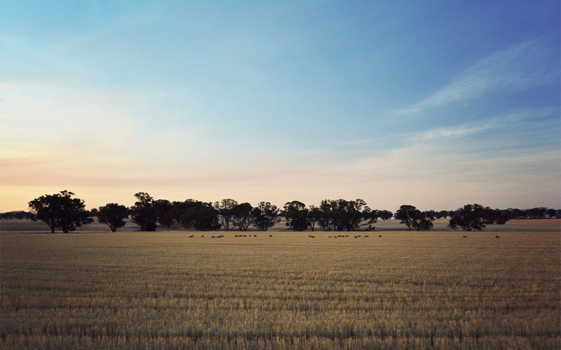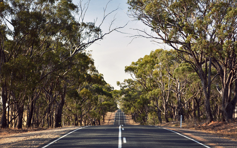 Soon we pick up a long series of short rolling hills on the road that heads south toward Carisbrook, but it comes with a line of trees on either side that give some shelter from the sun that's already causing the distant fields to shimmer in the waves of heat at 9:00 in the morning. Cows and sheep walk across the fields in small groups, headed for the shade of broad gum trees, where they'll probably stay huddled close to one another for the next nine hours. But they are the lucky ones. We spend far more time than we should saying terrible things about the farmers who let their animals wander in fields where no trees or barns or other shelters exist anywhere. In a part of the world where 110 degree days happen all the time it is without question an act of animal cruelty.