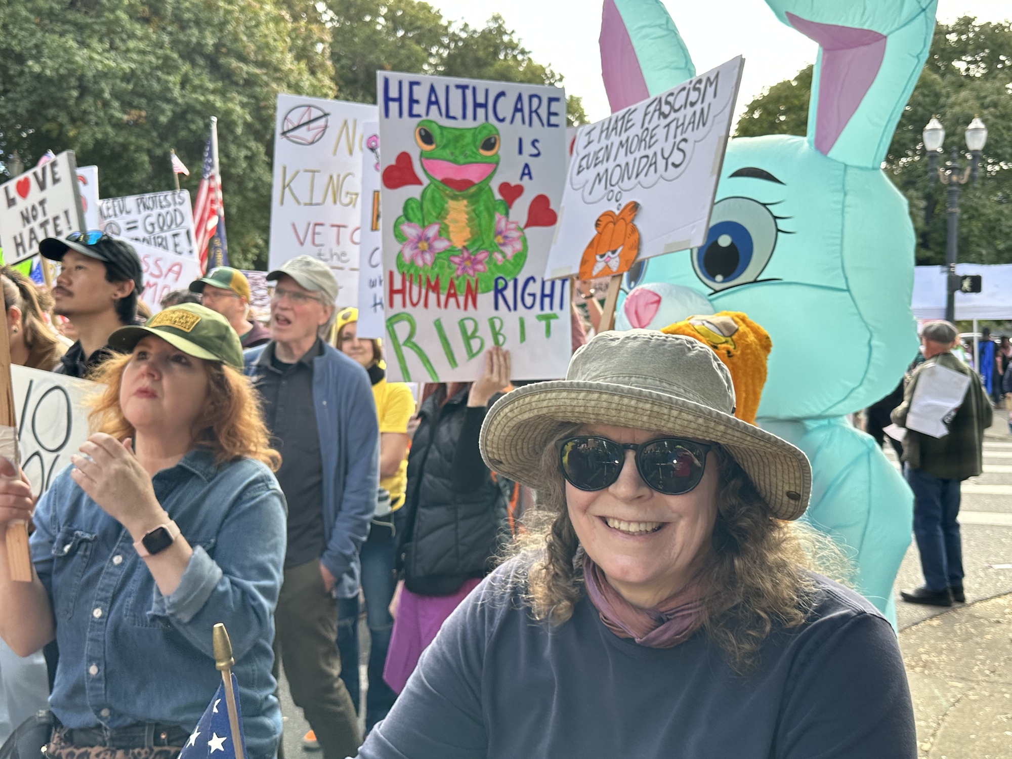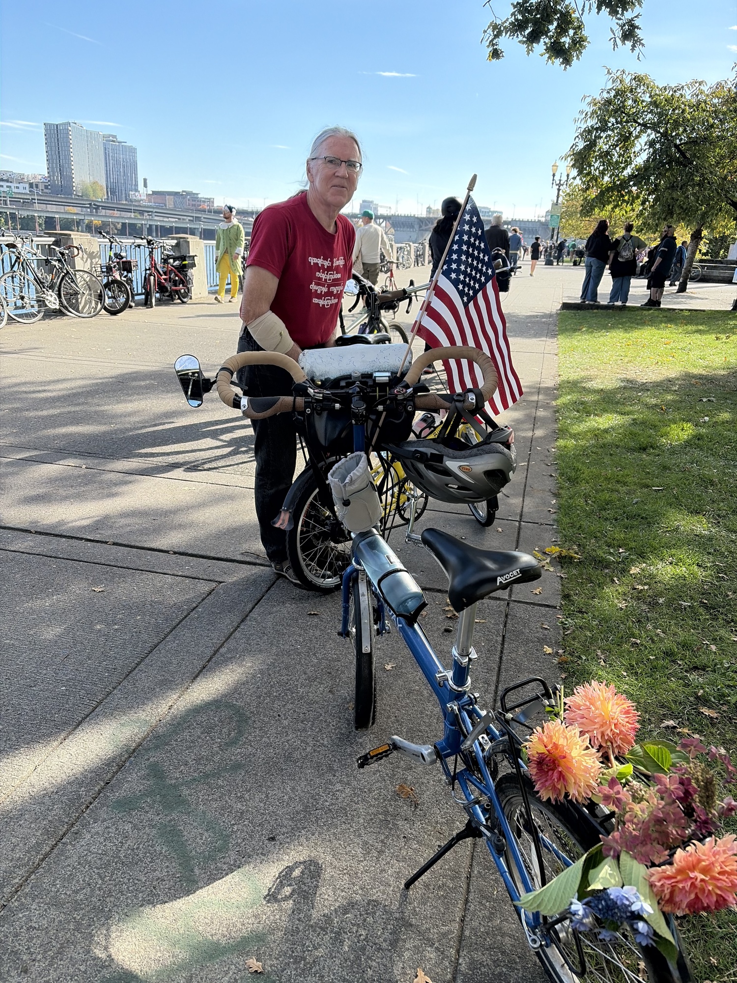 It’s an interesting time to be alive, isn’t it? A week ago we were marching in Portland’s “No Kings” protest with 50,000 of our friends and neighbors, with signs and whimsical costumes and flags. Well, we didn’t have signs or costumes, but I had a flag and flowers on my bike and Bruce wore a red shirt that said “Stop Dictatorship Now” on the back.