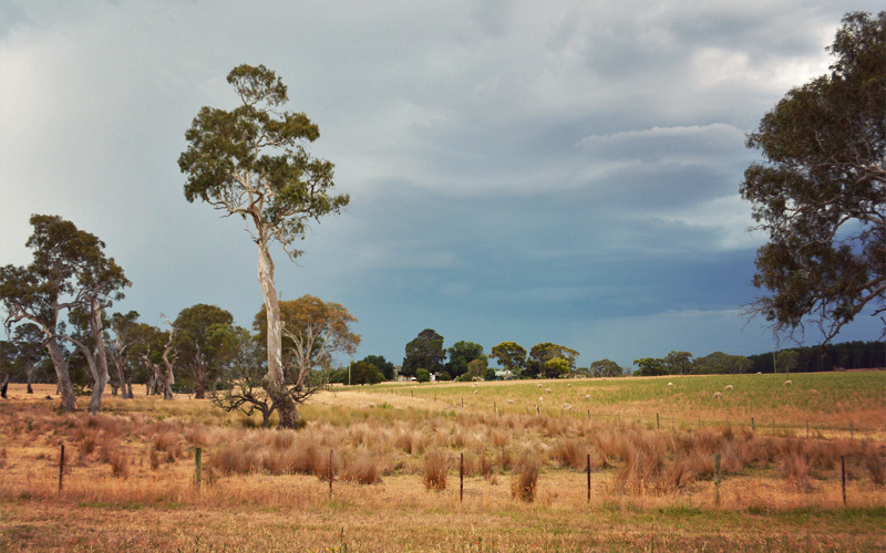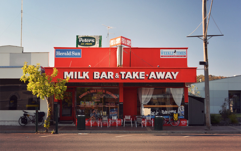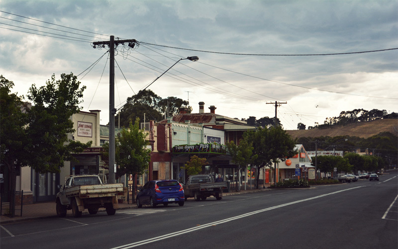 Then from what seems like out of nowhere, the land on which we ride drops away and we shoot down steep hills. They level out for a few dozen feet while crossing a creek before climbing up what feels like a wall on the other side, as if they've been imported from New Zealand. It's like this all the way to Castleraine, where stock trucks with double-decker trailers taller than a two-story house rumble down the highway through the center of town, leaving the stink of cow or sheep shit hanging in the air behind them.
